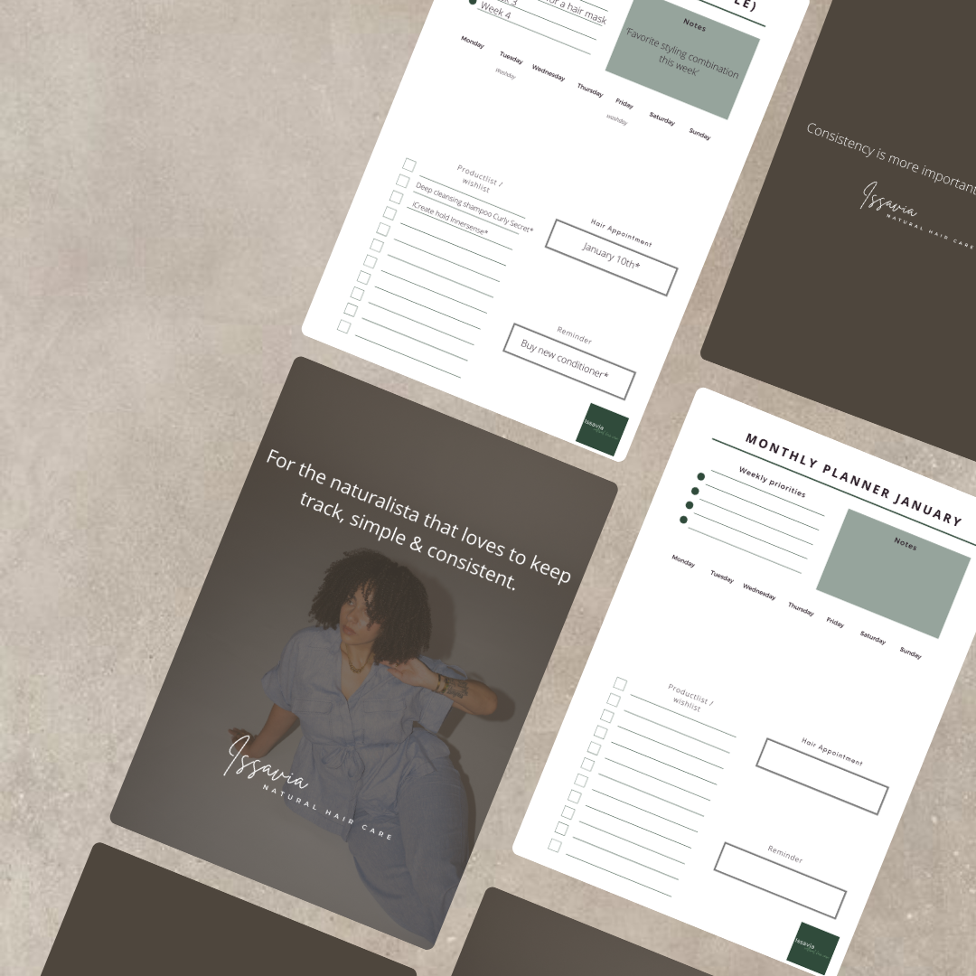 For the organized naturalista! - Maandelijkse planner. - Wekelijkse haar prioriteiten. - Productlijst/wishlist. - Notities om de perfecte styling combinaties nooit meer te vergeten.